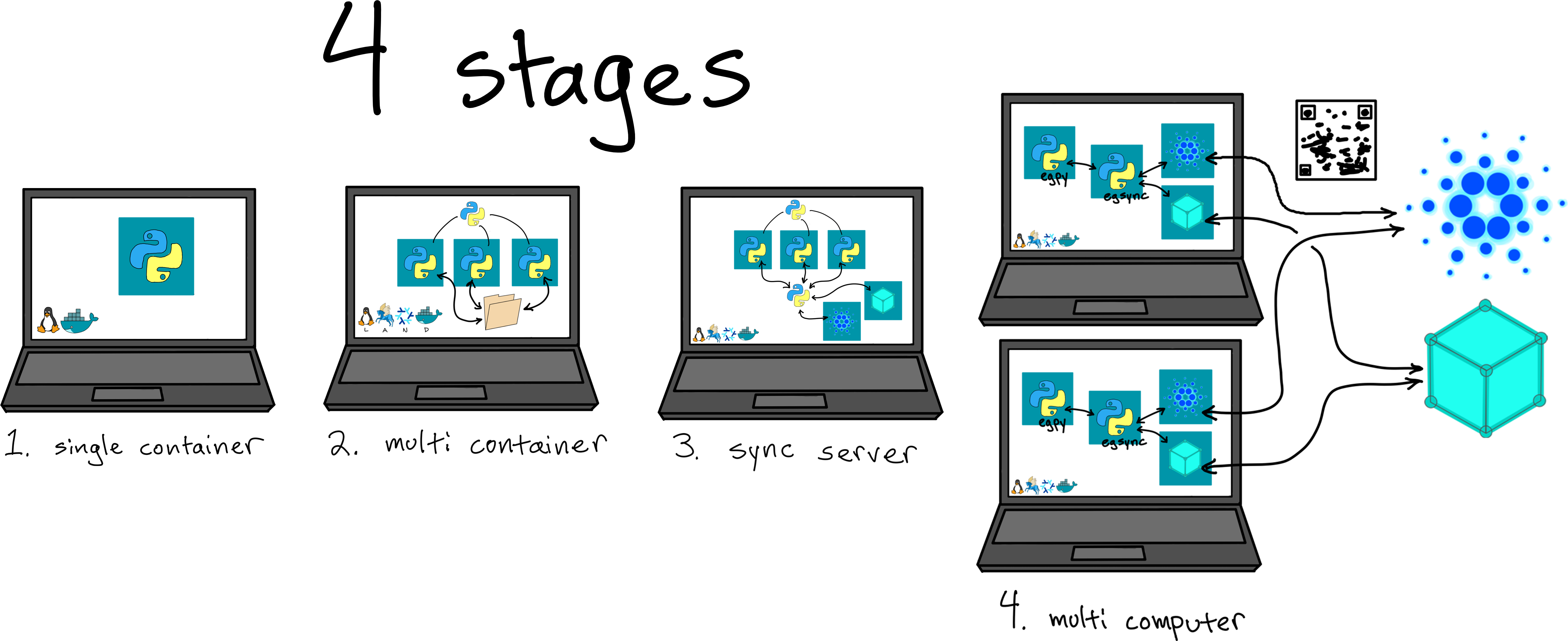 The containers each have a private state in data/private/<container name>, and they communicate only via a shared data/public folder. For now we’ll just pretend it enforces the rules of a blockchain: files in there are timestamped, immutable, and digitally signed by the wallet of the party that added them. In milestone 2 (confusingly referred to as stage 3 in the diagram above) I’ll work on publishing these files over Cardano + IPFS.